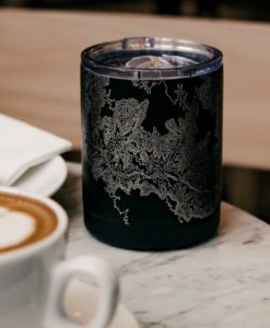 Custom engraved map of Ring of Kerry, Ireland and coordinates on 10oz double walled insulated stainless steel cup in matte black. Measurement – 5in x 5in x 4in.