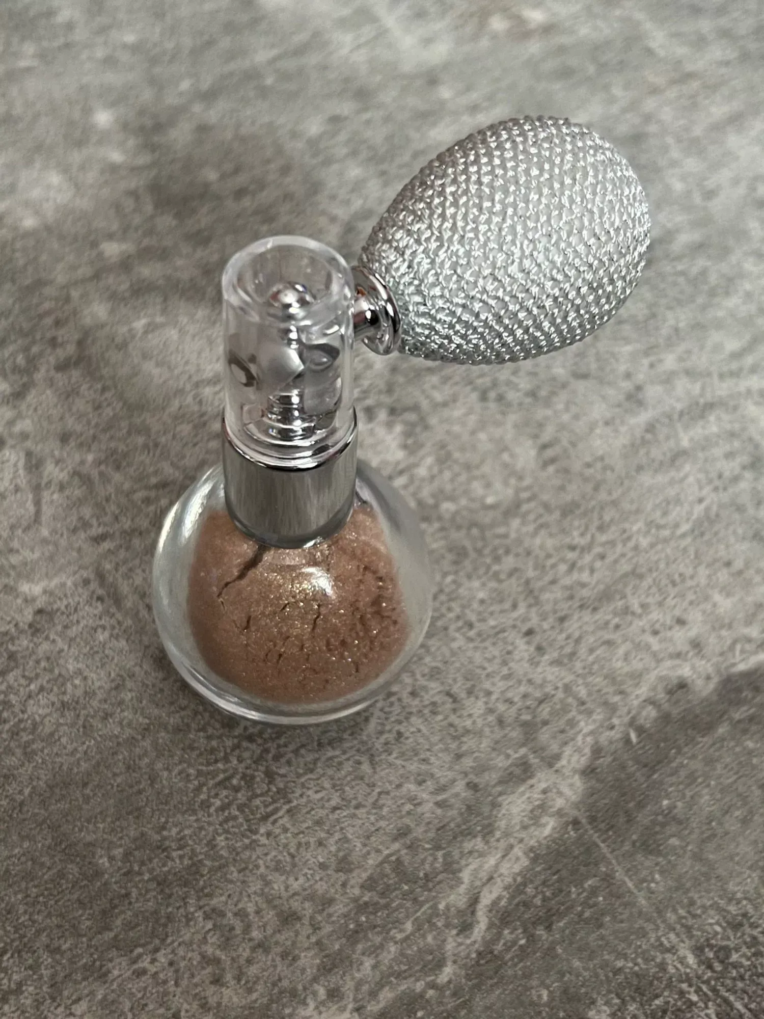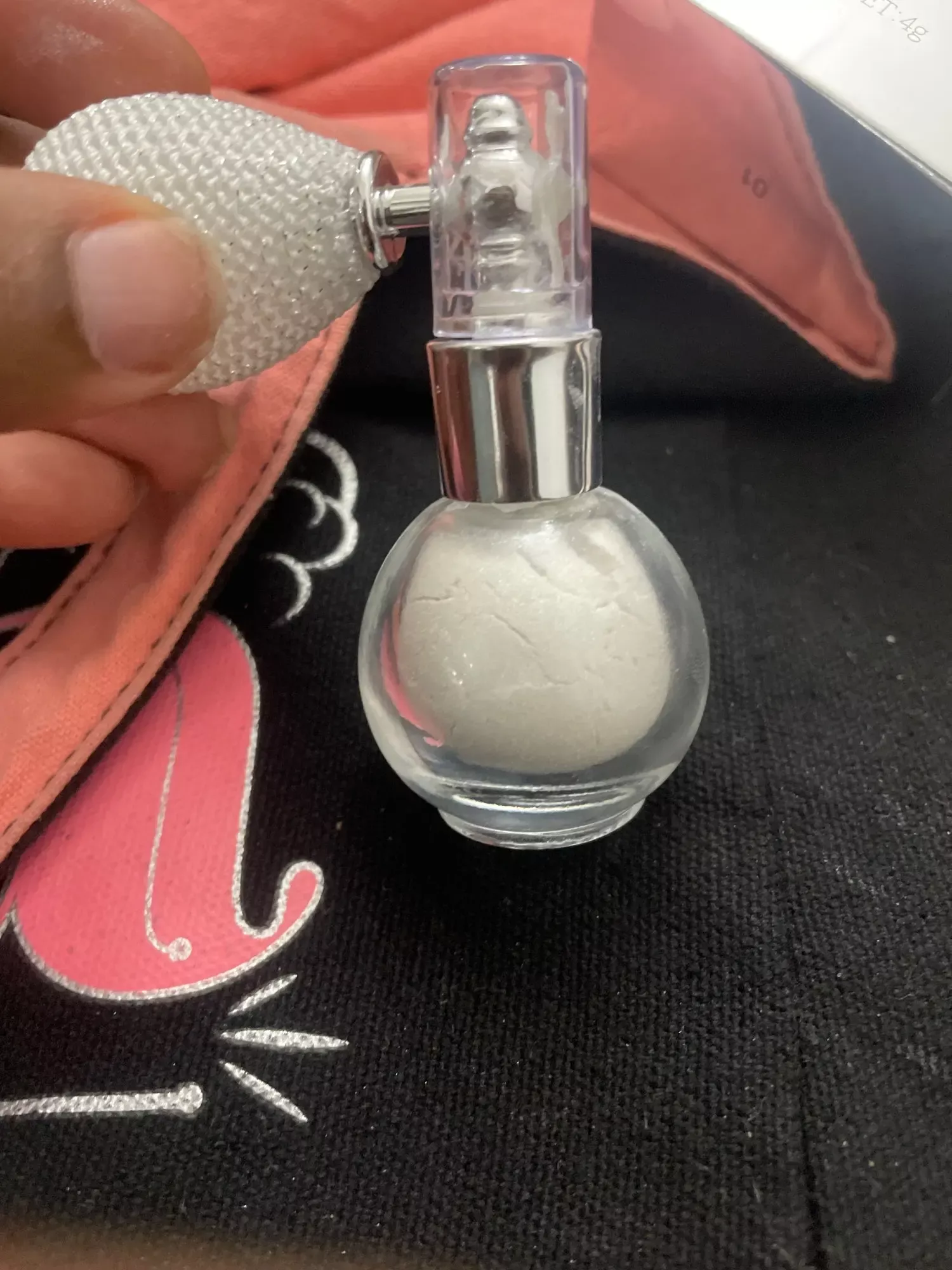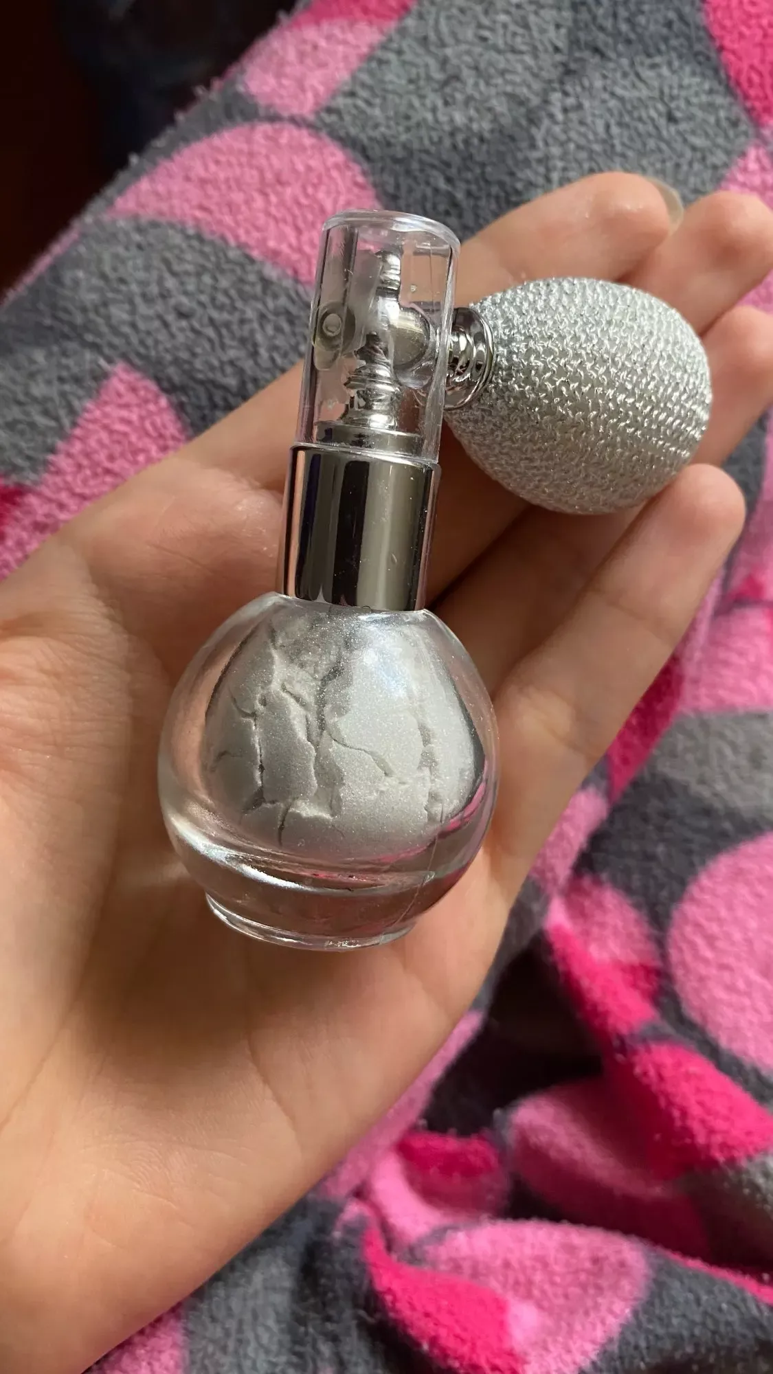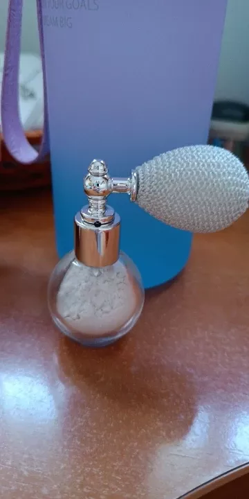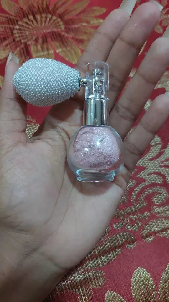 This product is GREAT! It offers a soft, white, sparkly shine that can be built upon. It comes in a charming, old-fashioned squeeze puff bottle that adds to its allure.