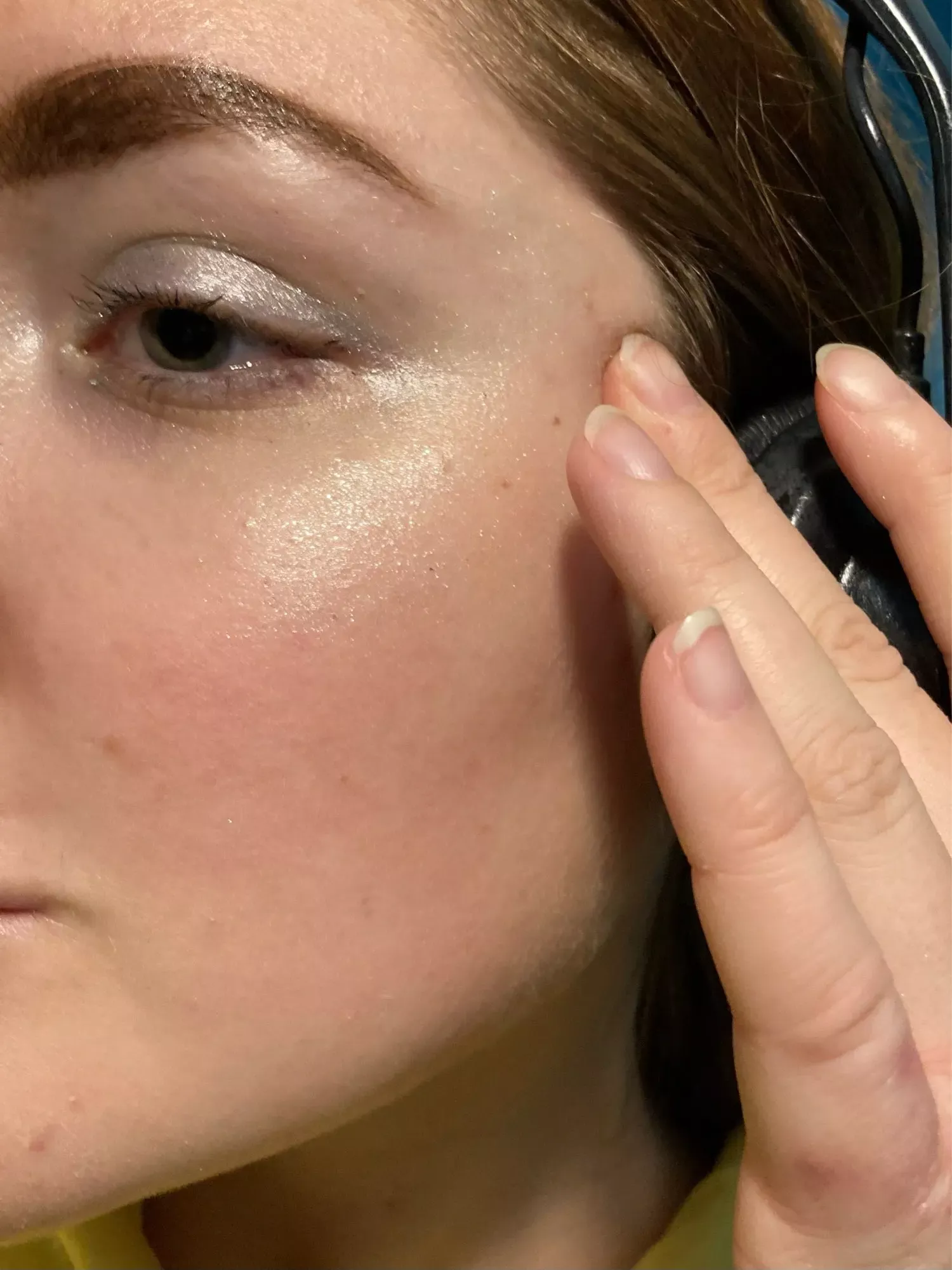 The product has a baby powder scent, but it works well otherwise. It’s a bit more powdery than I expected, yet still delivers a nice shimmer.