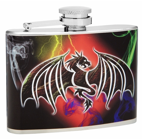 It’s difficult to go wrong in any design when the print features a black dragon, lighting, smoke and bright colors which is why this hip flask is perfect for any lover of dragons. The dragon is mostly black but is textured and the background is also black with a red smeared diamond in the middle behind the dragon. Throughout the flask, the print is blue and green with white waves of smoke. There is a yellow lightning bolt near the top as well. This compact 4oz hip flask is a great gift for dragon enthusiasts!