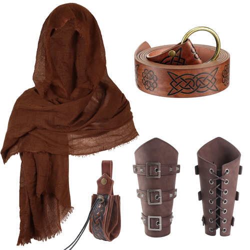 Enhance your medieval or Viking costume with this 5-piece cosplay set, including a belt bag, Celtic Viking coin pouch, scarf, and bracers. Choose the perfect combination to complement your look for any historical event or cosplay.
