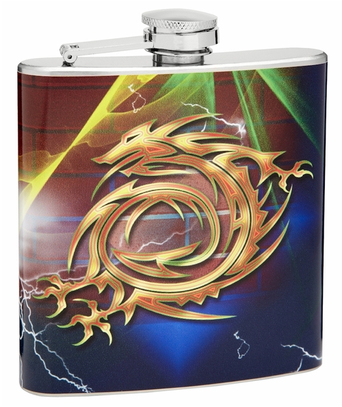 This compact 6oz hip flask features a golden spiral dragon whose body curls around itself in a swirling pattern. The dragons claws are spread out as though it were about to grab lunch. The dragon is intricately designed and set against a brick wall background that has colorful smoke patterns and lightning throughout. Our designers created this custom fantasy flask in honor of the Dragon. The flask is also handmade!