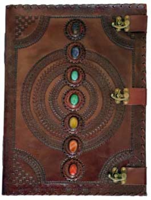 A massive tome with three latches to keep it closed and a line of 7 Chakra stones running down the front over the simple mandala centered on the cover. Embossing at the edge and on the rear cover may vary. Size may vary slightly. 180 blank, handmade, linen parchment paper pages. 13 1/2″ x 18″, (made from goat leather). Latches show signs of oxidation.