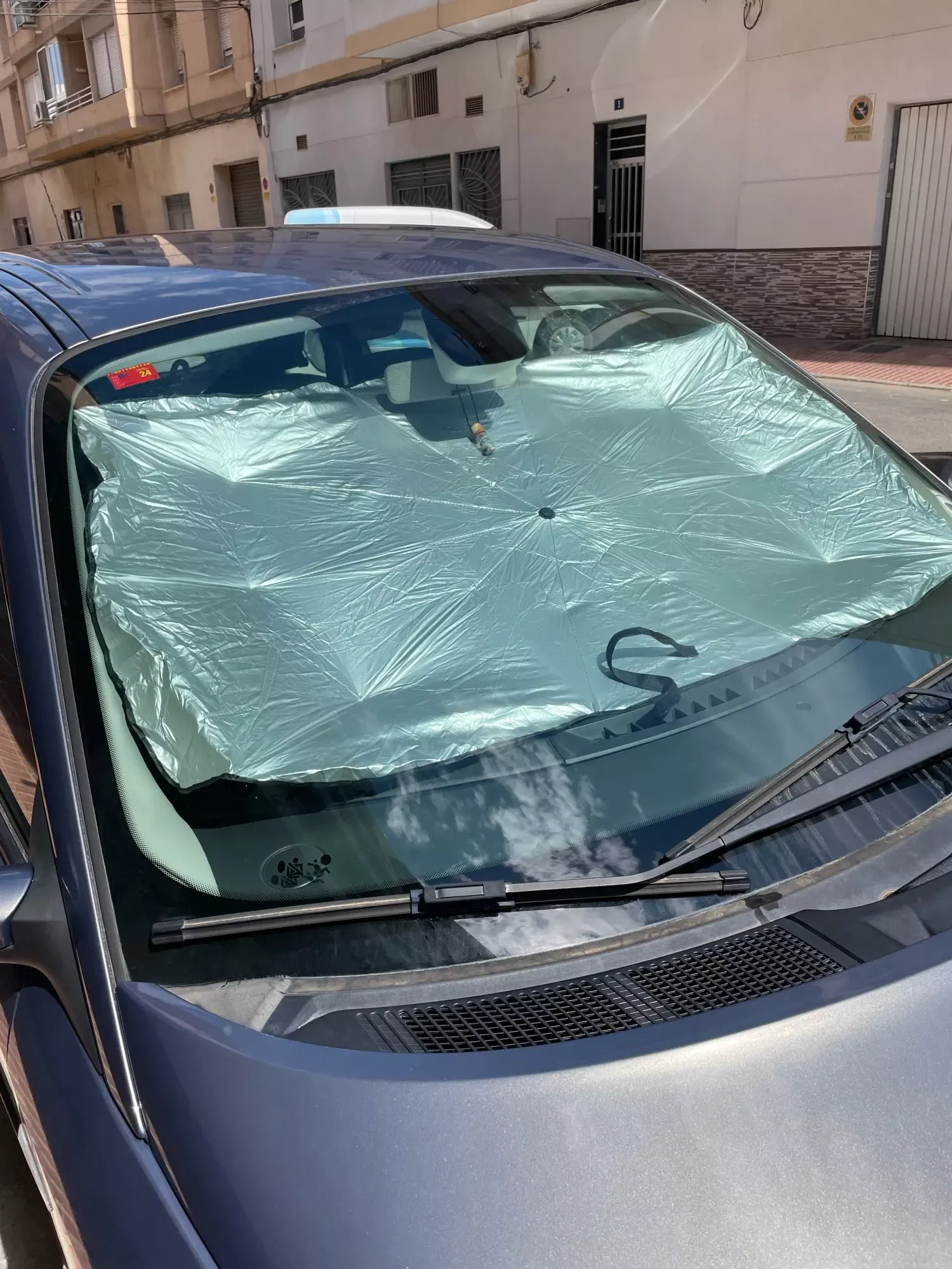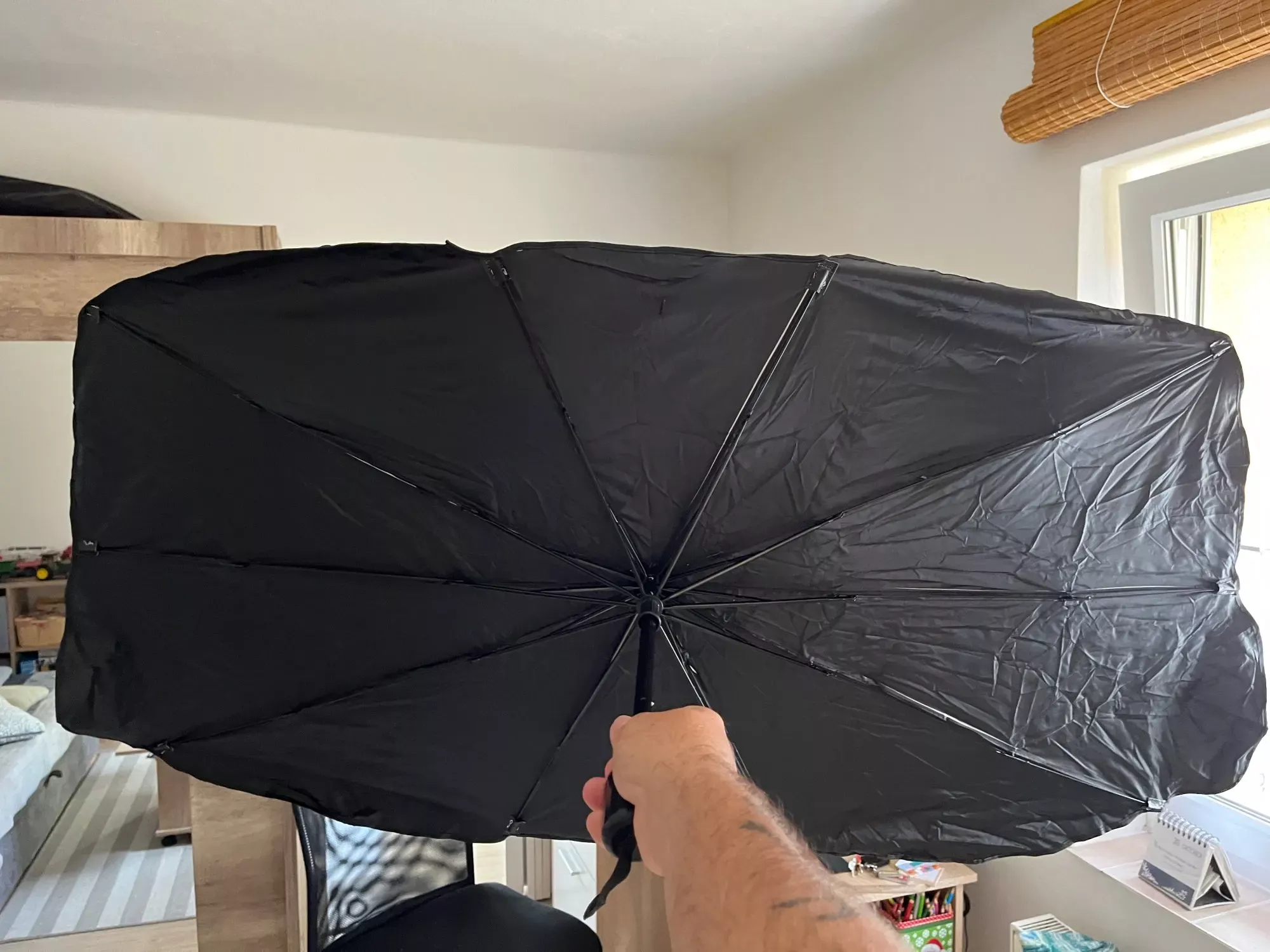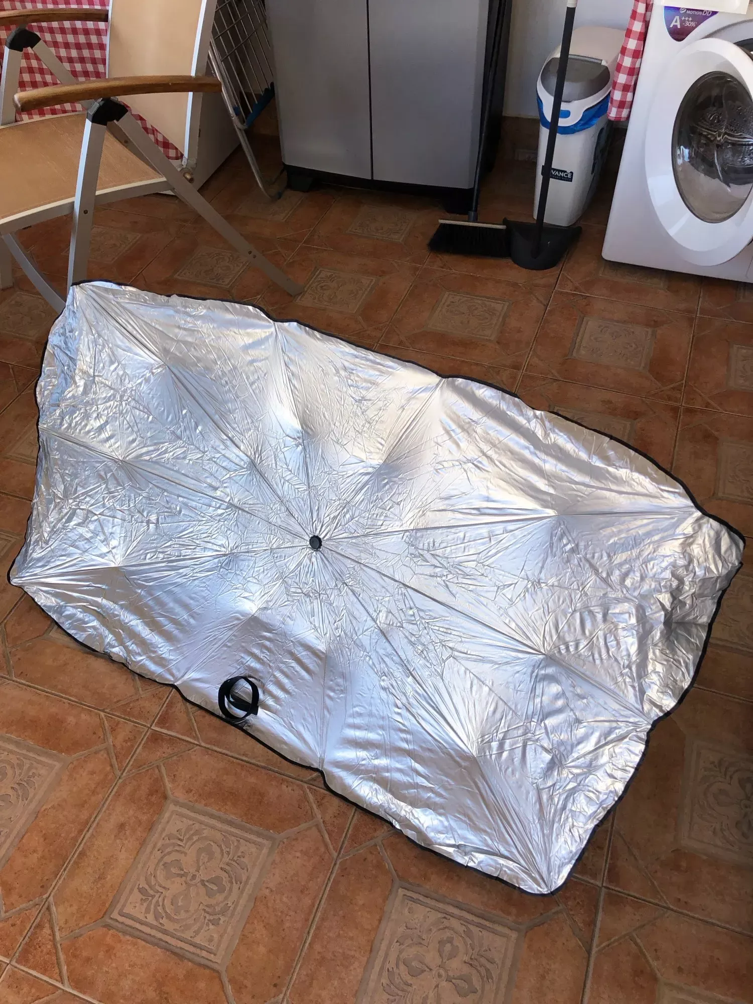 It’s like a mini umbrella for your dashboard. More efficient than cardboard shields and ideal for sunny places. Got one for my son in Germany too