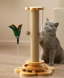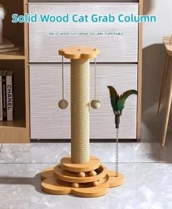 Our Cat Scratching Tower stands out due to its unique blend of practicality and design. The solid wood construction not only ensures durability but also adds an elegant touch to your home decor. The interactive elements like the tease stick engage your cat in a playful manner, promoting physical exercise and mental stimulation. The careful attention to detail, including a polished, rounded edge and a non-slip base, guarantees both safety and fun for your beloved pet.