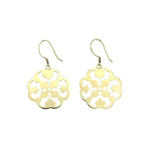 These intricately carved, clover like earrings turn war into peace. They are highly polished and handcast by a vulnerable artisan group in Cambodia from recycled brass bombshells.
