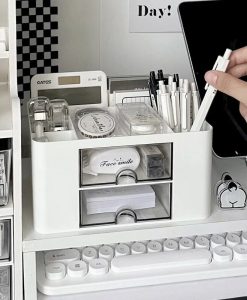 Not just any pen holder, this organizer boasts a large capacity with 2 drawers that double as a multifunctional storage box. It’s a versatile gem that accommodates more than just stationery; use it to store makeup, cables, and other small items that tend to create a mess. The clear design invites a minimalist charm while allowing you to see the contents at a glance, making it a practical and stylish centerpiece of your desk.