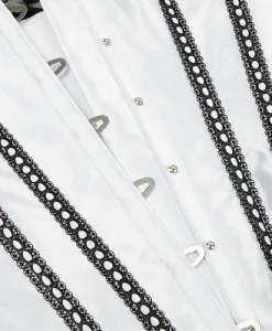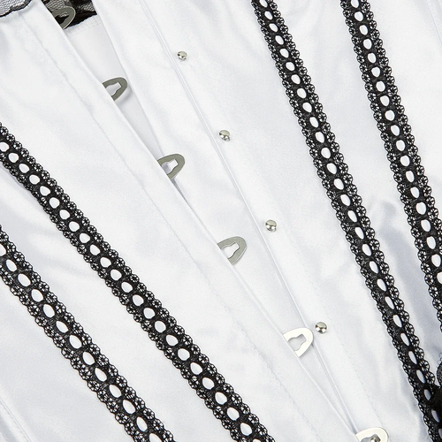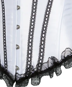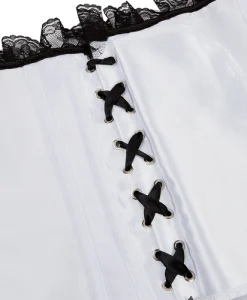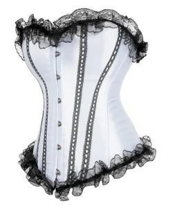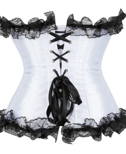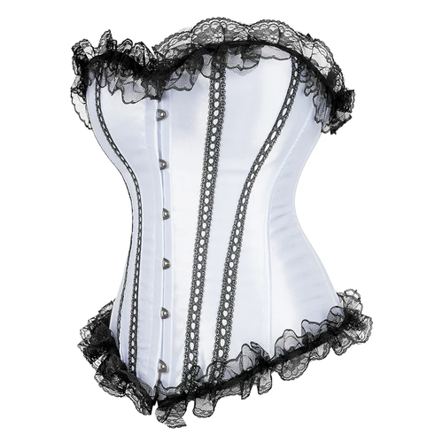 - Overbust Design: Fashionable lace-trimmed satin corset with a front busk closure.