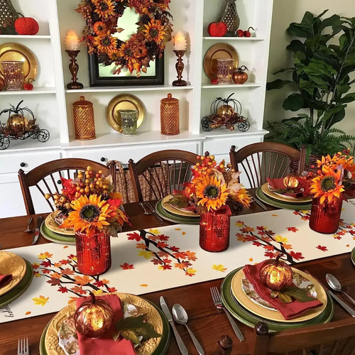 Elevate your fall decor with this beautifully crafted table runner, perfect for creating a warm and inviting ambiance during the Fall and Thanksgiving season.