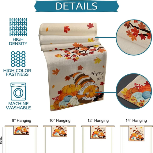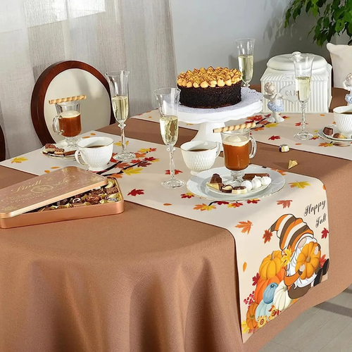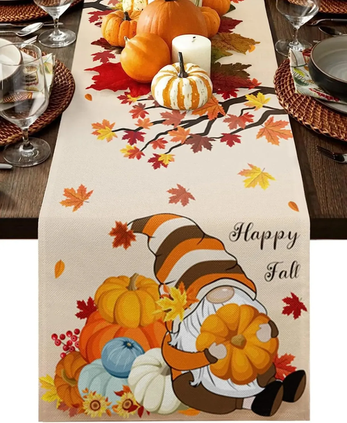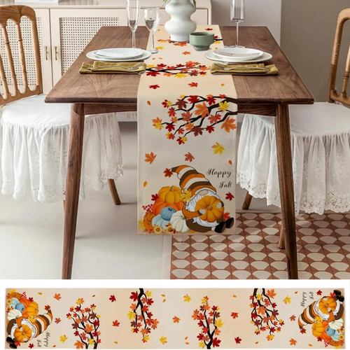 Step into the festive spirit with this charming linen table runner, designed to enhance your fall and Thanksgiving celebrations. Perfect for adding a cozy, rustic touch to your table setting, this runner is adorned with autumnal designs featuring gnomes, pumpkins, and maple leaves.
