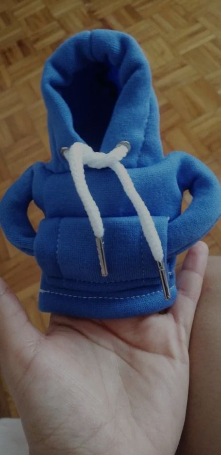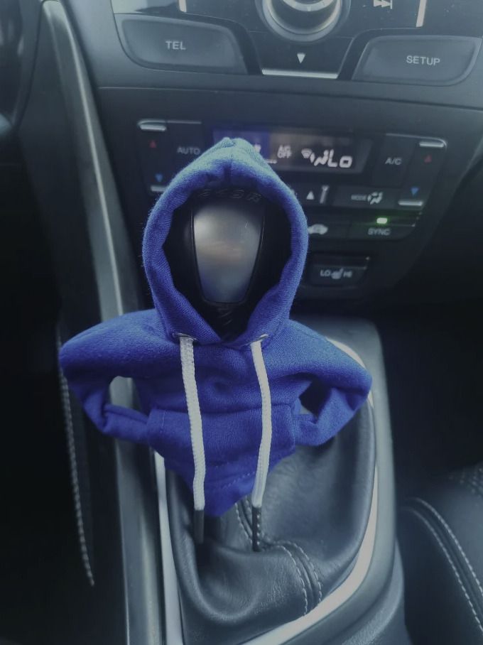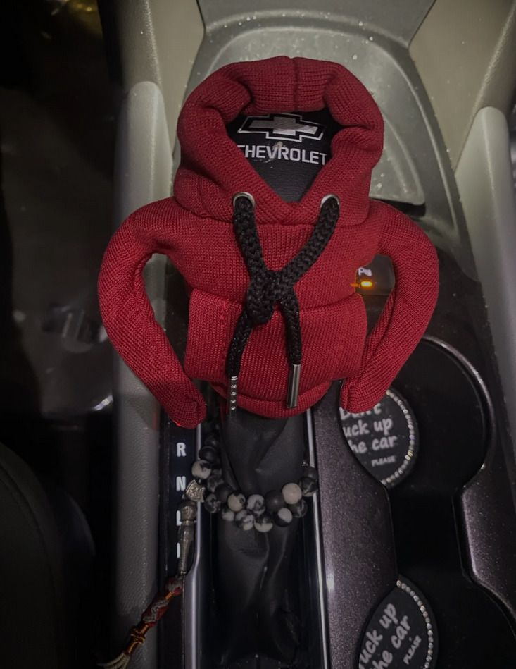 This miniature hoodie fits nicely on the gear shift and has received many compliments.