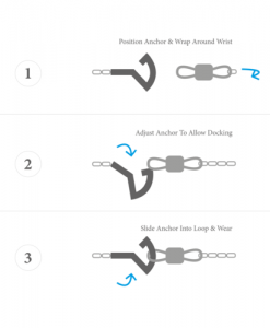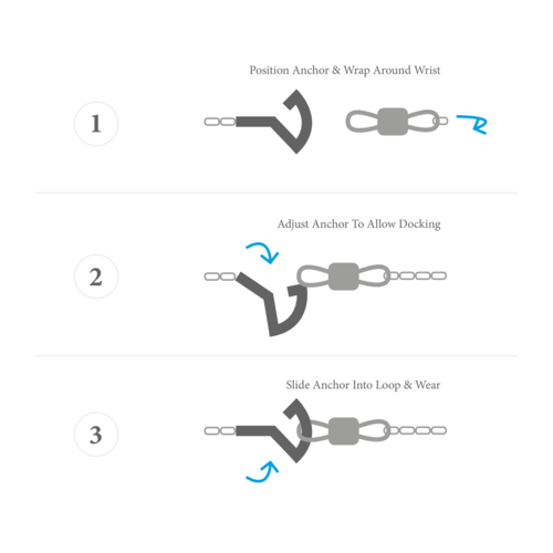 This bracelet is available in four bracelet lengths, 17cm, 19cm, 21cm or 23cm in circumference. To take the bracelet on or off your wrist, simply (un)clutch the leather loop from the anchor clasp.