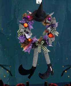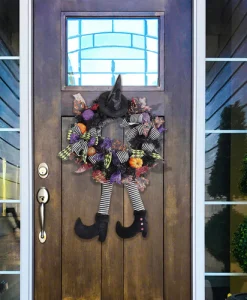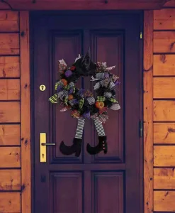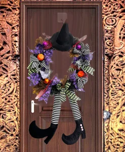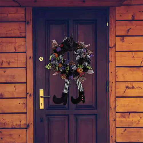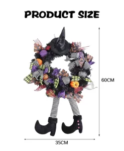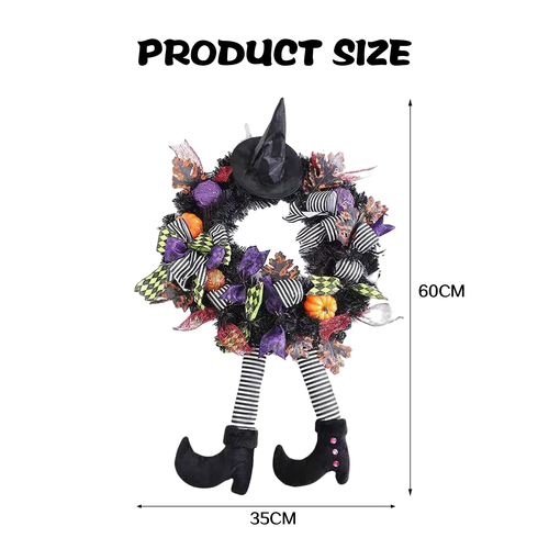 Step into the Halloween spirit with this Halloween Witch Hat and Leg Wreath Decor, perfect for adding a festive touch to your home. Whether displayed on your front door, wall, or indoor spaces, this eye-catching ornament is sure to add whimsy to your halloween decor.