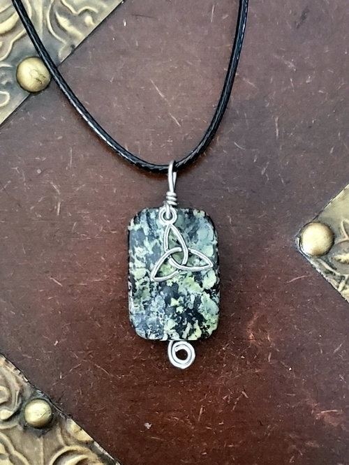 Green serpentine jasper stone with silver-tone swirls and a trinity knot charm. In history, the Trinity represents the power of three which can be interpreted to mean different things from the Mind, Body, and Spirit connection to the unending cycle of Life. Wear this ancient symbol proudly!