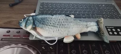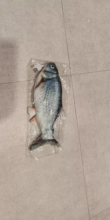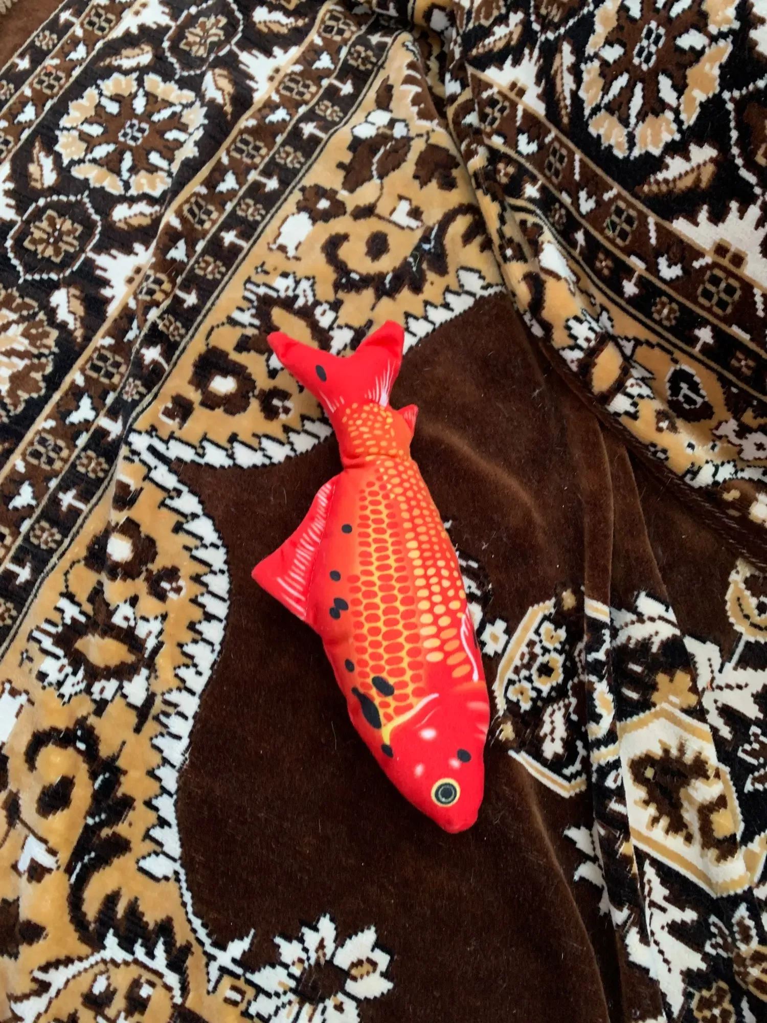 The plush part seems professionally made, including the zipper. The printed design looks like a real fish, and the realistic flopping action is quite lifelike. It flops for 10-15 seconds when tapped, kicked, or dropped, then stops until it’s nudged again. There’s an on-off switch for when it’s not in use. I love that it’s USB rechargeable, no need for batteries.