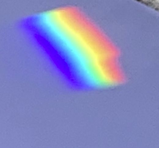 When I looked out the window through the prism, I was able to see multiple rainbows inside it, each spanning the entire length of the prism, with several rainbows stacked beneath one another.