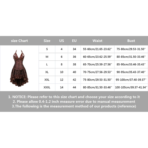 - XXXL (US 14 / EU 44): Waist 80-85cm (31.50-33.46″), Bust 100-105cm (39.37-41.34″)