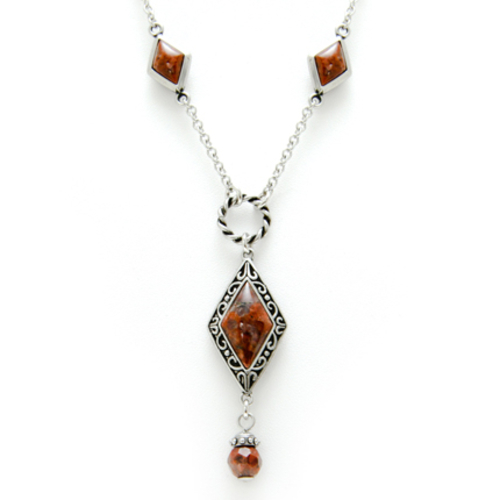 This necklace brings you a touch of ancient symbolism with a modern twist. The rhombus was used by the ancient Greeks to symbolize the solid of the world, spinning forward in its history. While our recycled stainless steel and red marble add an environmentally conscious touch.