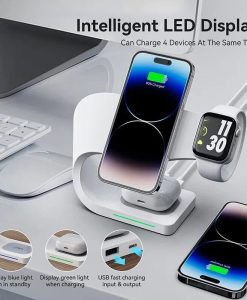 With QI standard compatibility, this charger is perfect for iPhone 8 and above, Apple Watch series, and AirPods 3/2/Pro. Its intelligent LED indicator display keeps you informed of the charging status, turning blue in standby and green when charging. The package includes everything you need to start charging right away, making it the ideal solution for your charging needs.