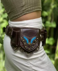 - Design: This unique steampunk and bohemian-inspired belt bag features intricate detailing with contrasting blue trim, adding a bold, stylish accent.