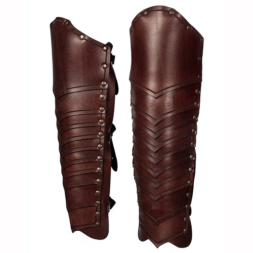 Complete your medieval warrior look with these Medieval Viking Warrior Knight Faux Leather Leg Armor Greaves, available in black and dark brown. Designed for both authenticity and functionality, these greaves offer protection and a striking aesthetic for any costume or reenactment.