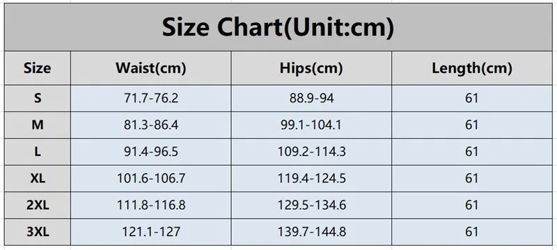 3XL: Waist: 121.1-127cm, Hips:139.7-144.8cm, Length: 61cm