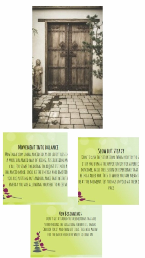 The Messages From the Shaman Oracle Deck was created using a grounding beautiful ancient door on the back and the front is shadows of green and yellow with a purple flower and black stepping stones which represent the steps one is taking on their path with the card meanings. This is a 48 card oracle deck.