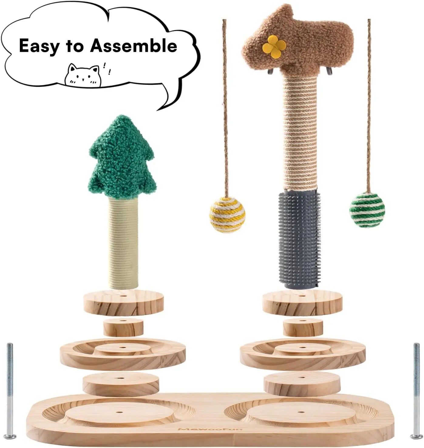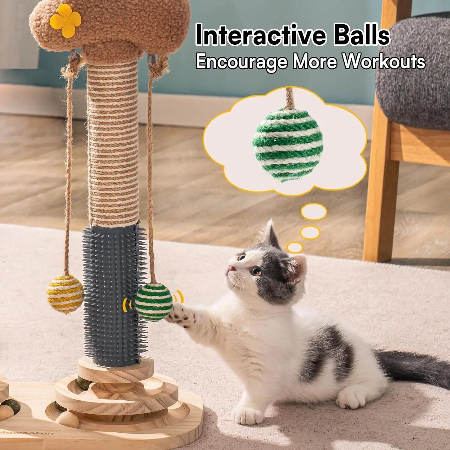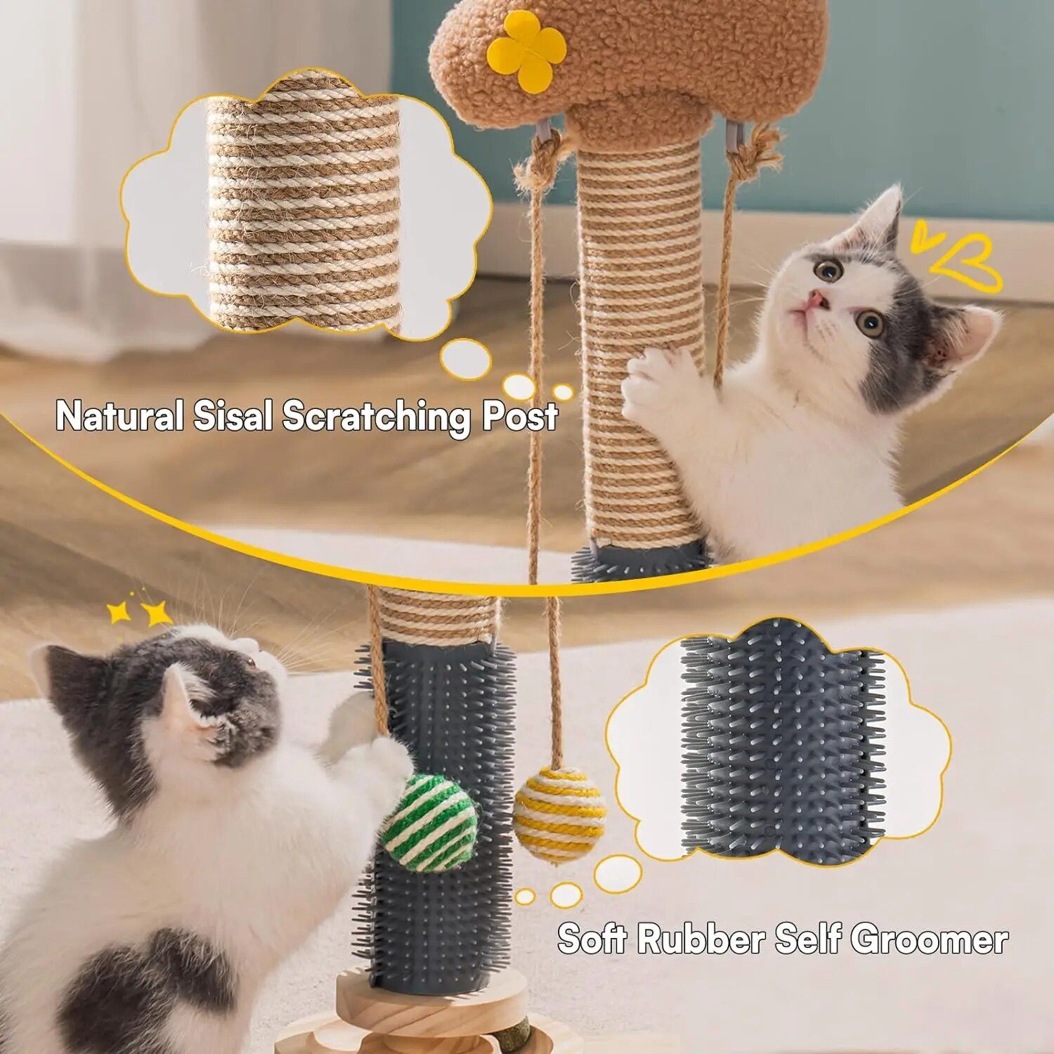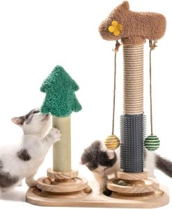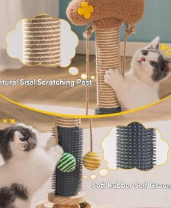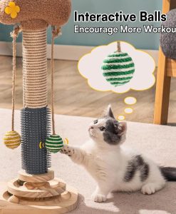 - Multi-functional Design: Play, scratch, massage, and romp all in one! With a scratching pole, self-groomer, 2 sisal balls, and a 3-tier base equipped with 8 track balls, this Cat Pole is perfect for cats who crave variety. Plus, it’s spacious enough to entertain multiple cats at once.