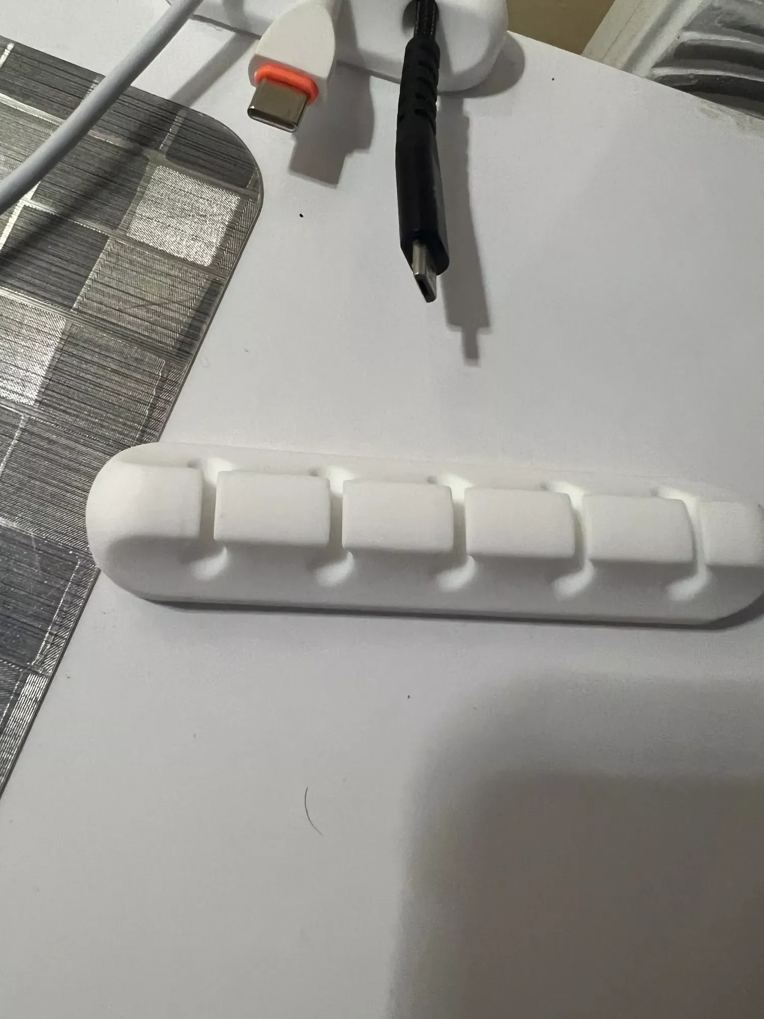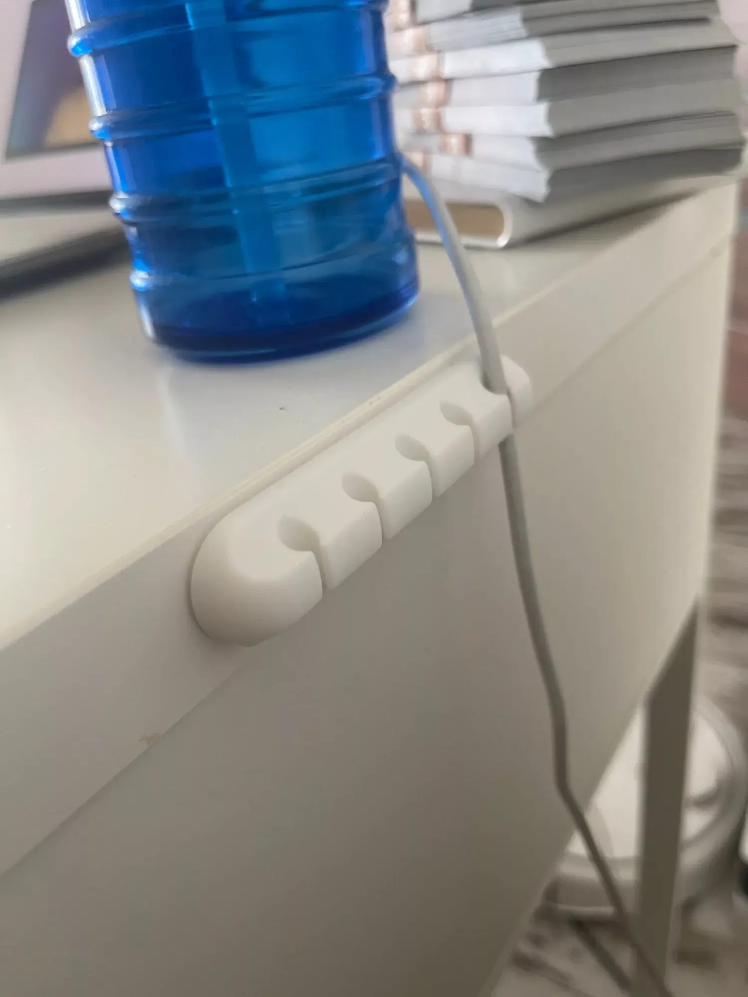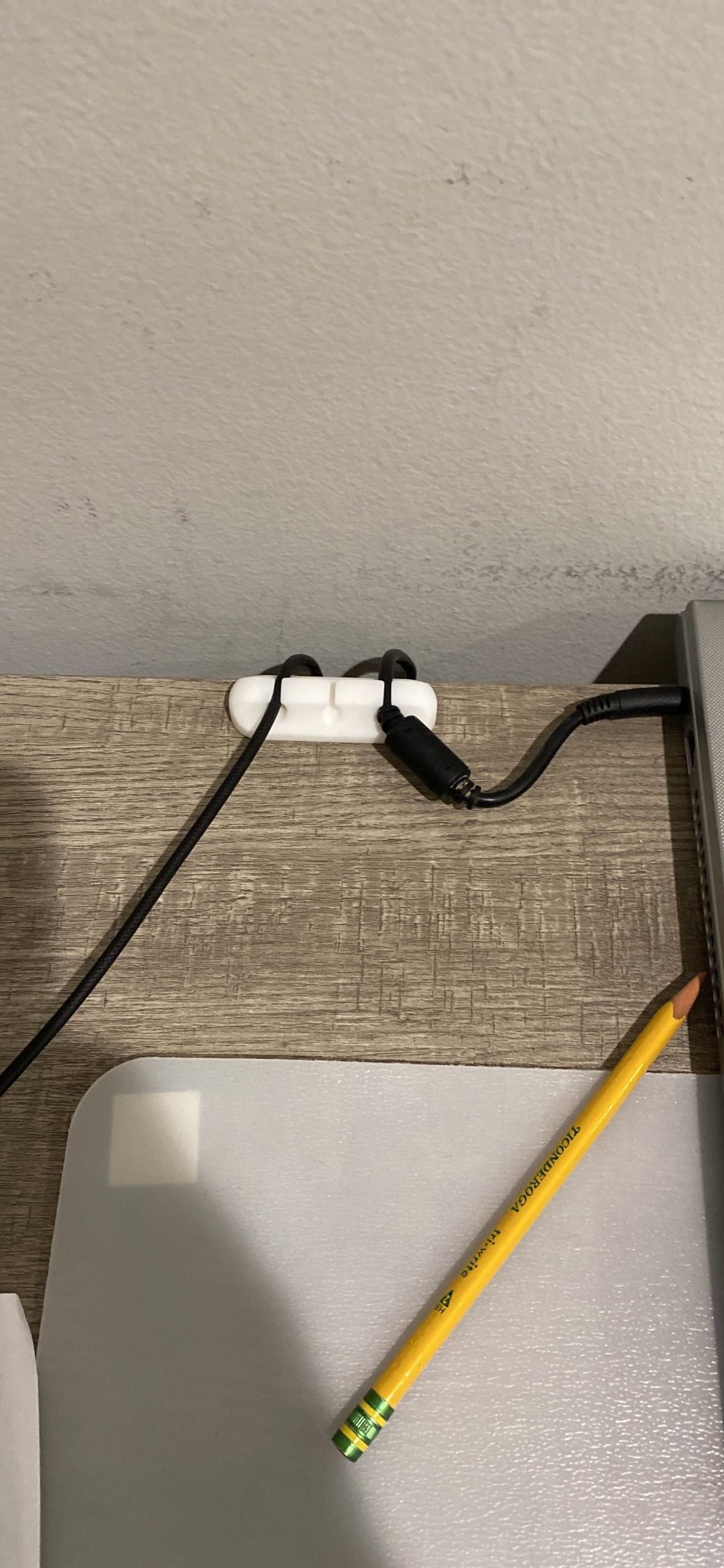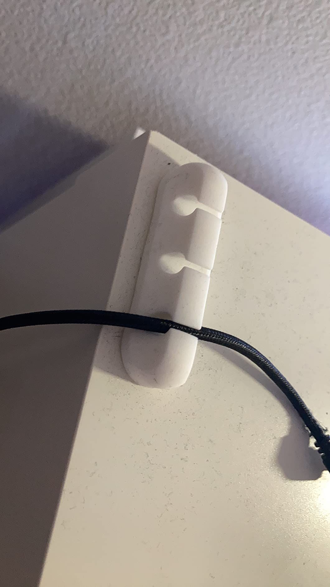 I attached this to my bedside table to keep my phone cord accessible while my baby sleeps. It’s been working well and blends nicely with my white table.