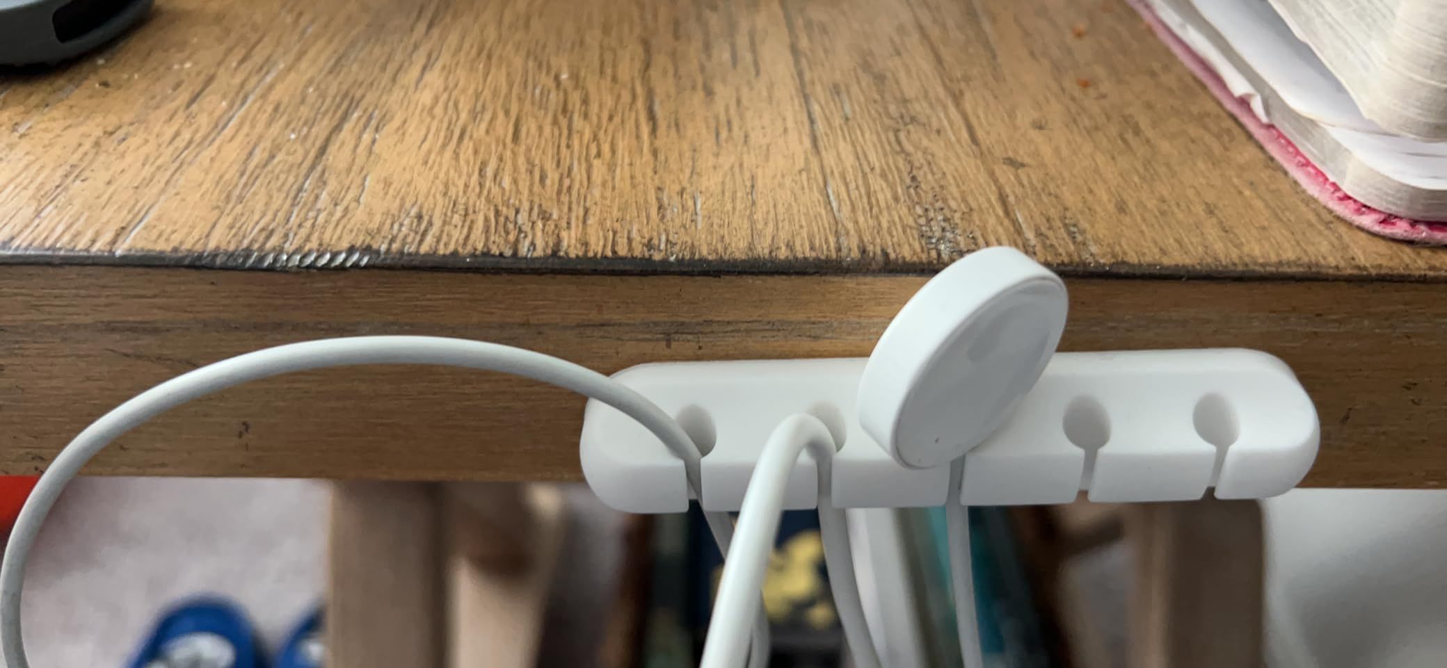 This product solved my problem of charging cables constantly falling behind my shelf. Now, my tablet, phone, and watch chargers are organized and easily accessible. It sticks well to the wood surface and hasn’t shown any signs of falling off. I’d definitely recommend this to anyone with similar issues.