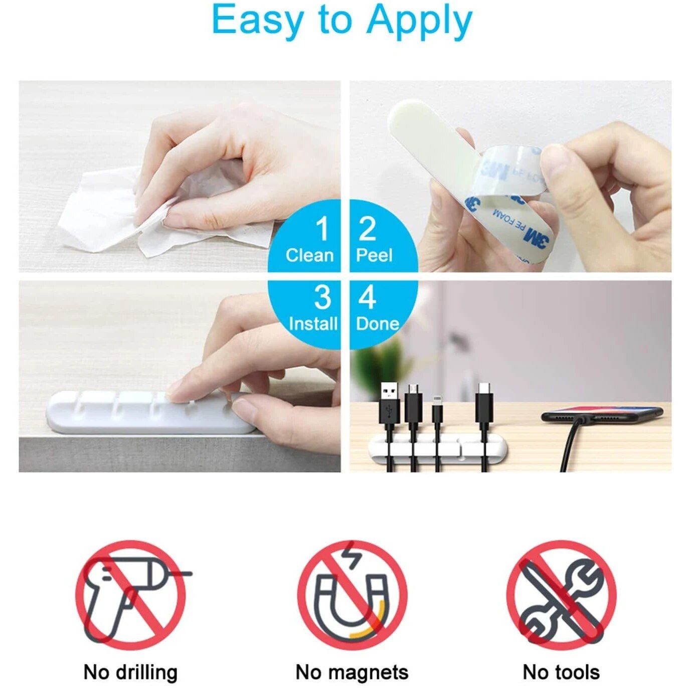 This product holds all my USB cables neatly on the side of my desk. The adhesive is strong, and it’s stayed in place without any issues.