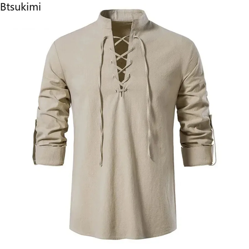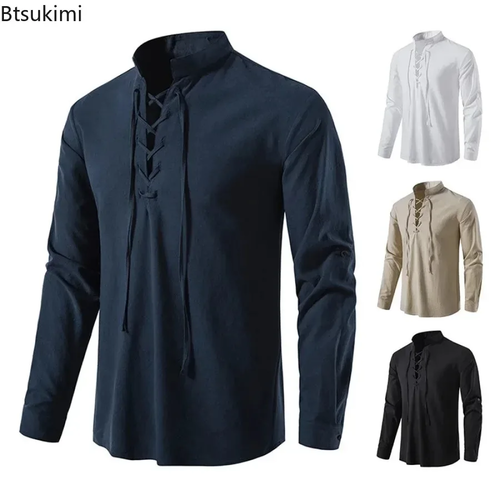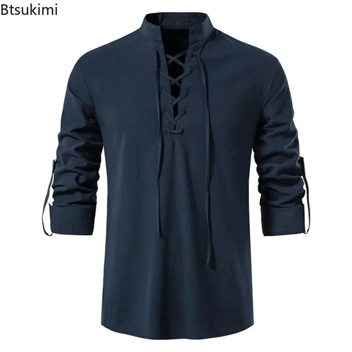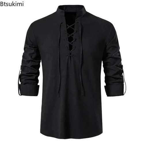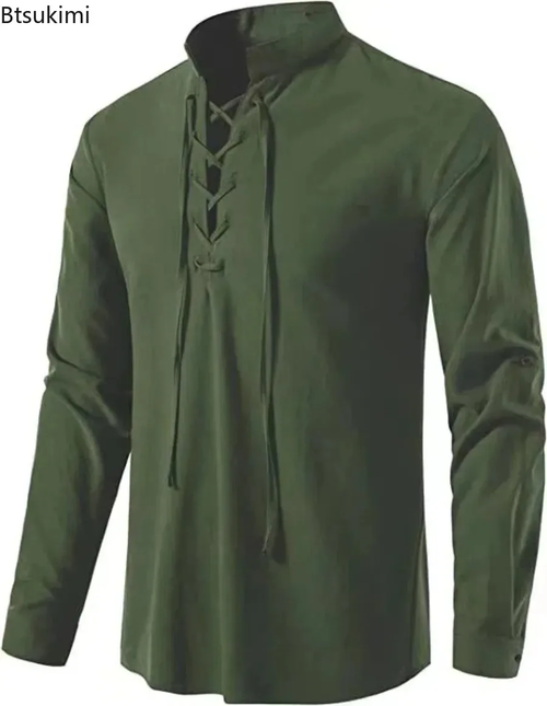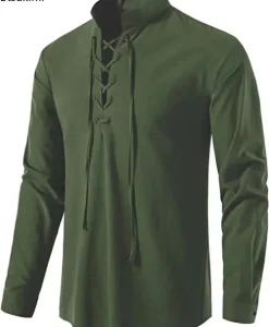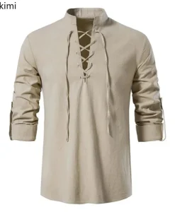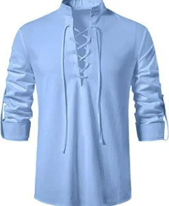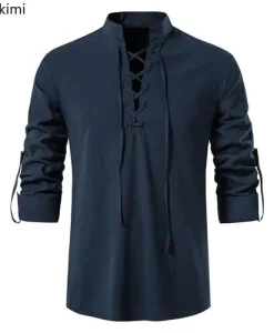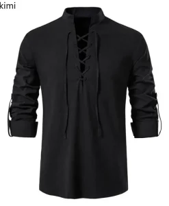 Elevate your style with this Men’s Casual Cotton Linen Shirt, designed with a classic medieval renaissance look. Featuring a long sleeve, stand collar, and lace-up front, this retro-inspired shirt is perfect for pirate cosplay, renaissance fairs, or casual everyday wear. Made from a comfortable cotton-linen blend, this top is breathable and soft, making it an ideal choice for costume events or laid-back outings.