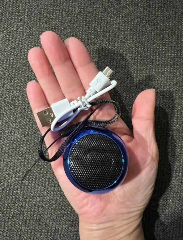 This speaker is small and comes with a handy carrying cord. Surprisingly, the sound quality is quite impressive and can get quite loud for its compact size. It’s great for listening to audiobooks, though I haven’t paid much attention to the battery life.