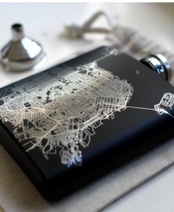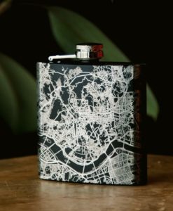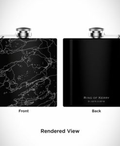 Custom engraved map of Ring of Kerry, Ireland and coordinates on 6oz hip flask in matte black. Includes canvas bag and funnel. Measurement – 5in x 1in x 4in.