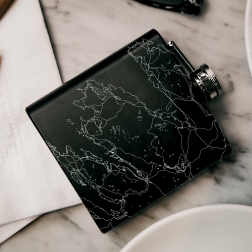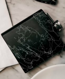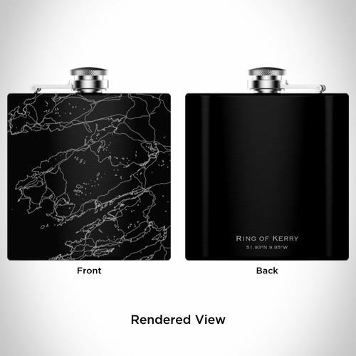 Custom engraved map of Ring of Kerry, Ireland and coordinates on 6oz hip flask in matte black. Includes canvas bag and funnel. Measurement – 5in x 1in x 4in.