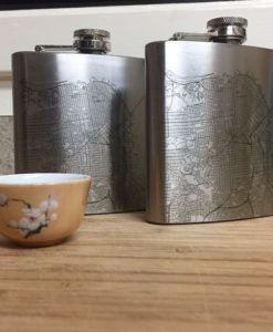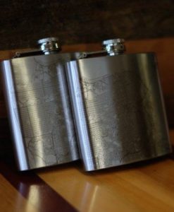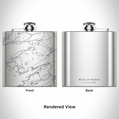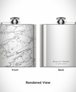 Custom engraved map of Ring of Kerry, Ireland and coordinates on 6oz hip flask. Includes canvas bag and funnel. Measurement – 5in x 1in x 4in.