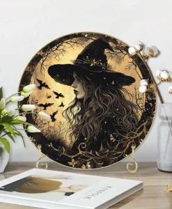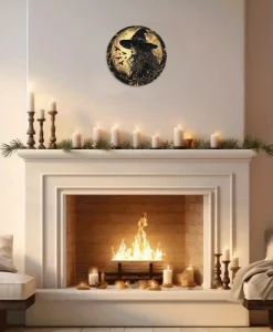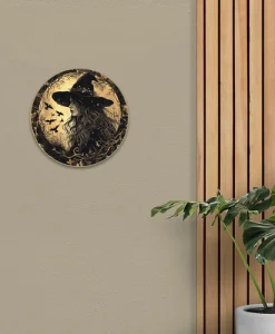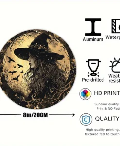 Elevate your space with this Round Metal Witch and Crows Sign, featuring intricate faux foil stamping and papercut art. Perfect for adding a touch of creativity and charm to various settings like living rooms, bedrooms, coffee shops, or storefronts.