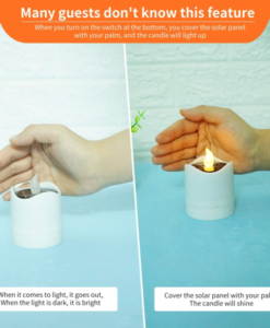 -Simple Operation — Users only need to place the top of the candle under the direct sunlight, open the bottom candle switch, and then automatically charge.