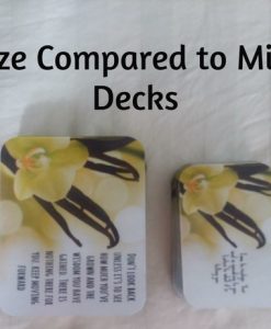 They are smooth, not too glossy so they can easily be used for video readings as well as in person readings and shuffle easily. Waterproof Approx Size 3 ⅓ inch x 4 inch, a regular sized oracle deck.