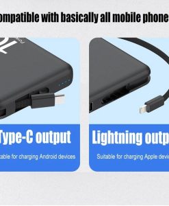 Our portable charger is more than just a battery; it’s a lifeline when you need it most. Boasting a large 10000mAh capacity within its compact 58*62*16mm frame, it’s tailored for convenience and efficiency. Crafted from durable ABS+PC material and equipped with a dual output system, this power bank supports simultaneous charging for two devices. Plus, it’s equipped with a built-in Type-C and Lightning cable, tailored specifically for your Android or Apple gadgets.