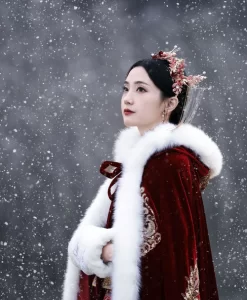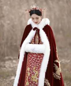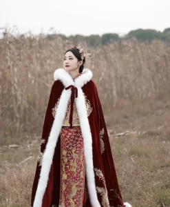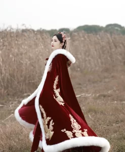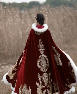 Enjoy this luxurious dark red long and warm winter bridal wrap with gold embroidery. This is the perfect elegant cloak for any stylish occasion.