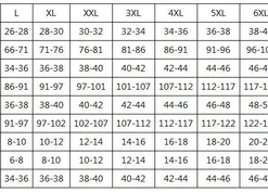 - S, M, L, XL, 2XL, 3XL, 4XL, 5XL, 6XL