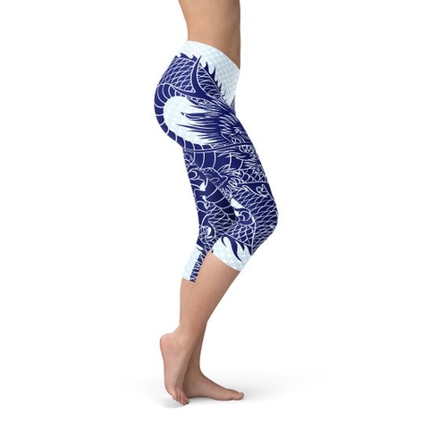 You’ll be a beast in the gym wearing our fierce Japanese Dragon Capri Leggings. With a cool dragon tattoo style silhouette and pastel light blue dragon scale background this piece is sure to turn heads at the gym.