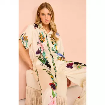 The set includes a long-sleeved, single-breasted shirt with a turn-down collar and ankle-length pants. The beautiful pleat decoration adds a touch of sophistication, while the vibrant print pattern ensures you stand out in the crowd. Crafted from high-quality polyester, the fabric is lightweight and perfect for warmer weather. The blend of synthetic fibers guarantees durability and a soft, silky feel against your skin.