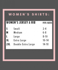 The design is printed on a Gildan-branded unisex shirt. Women-sized shirts run one size smaller and are printed on Next Level shirts.